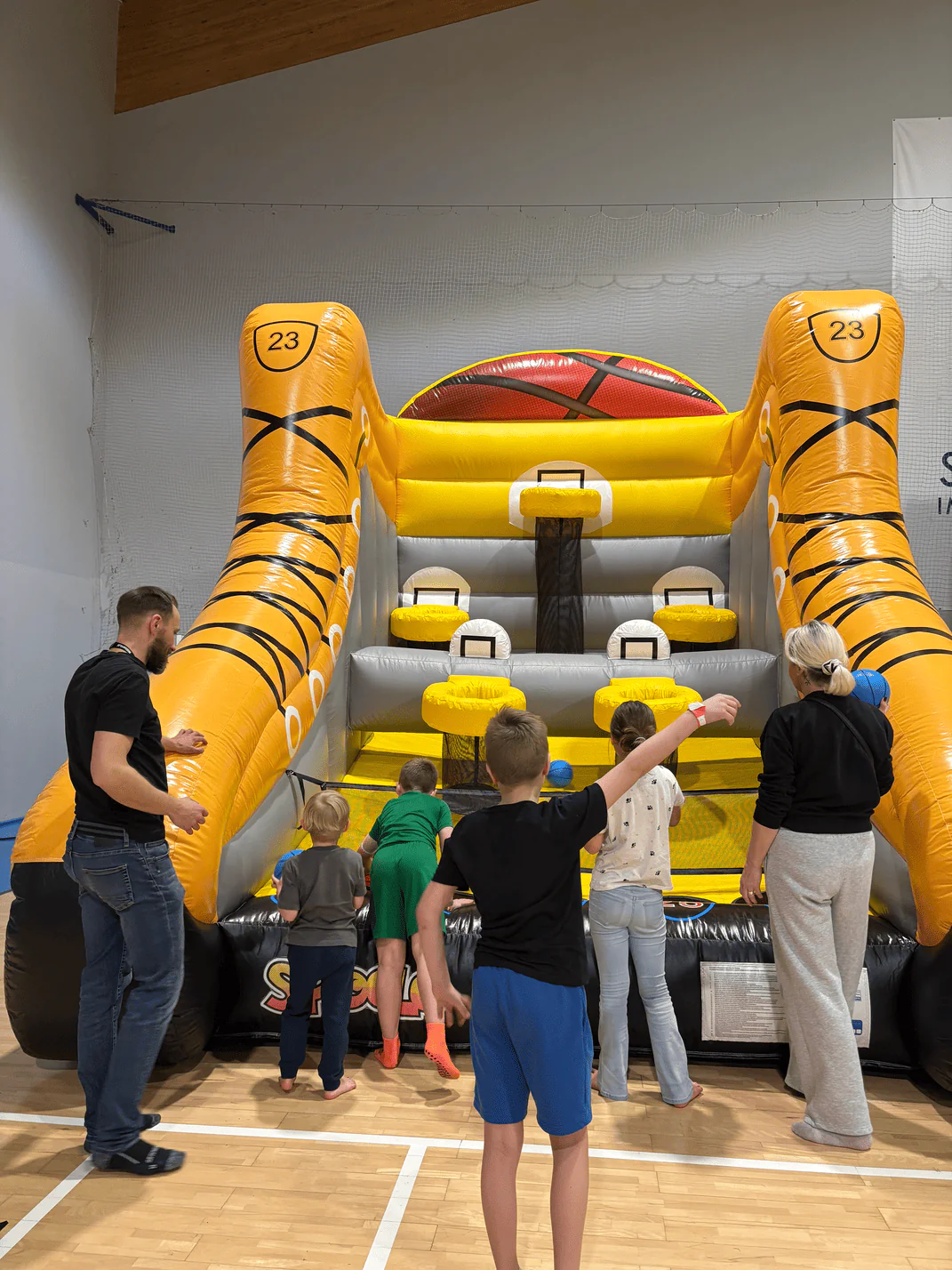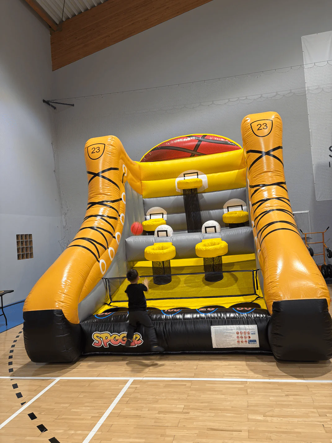 Gracze stają przed dmuchańcem i próbują trafić piłką do wybranych koszy. Cele są rozmieszczone na różnych poziomach, więc można ułożyć rozgrywkę tak, by była atrakcyjna zarówno dla dzieci, jak i starszych uczestników. Jeden z wielu dmuchańców do wynajęcia